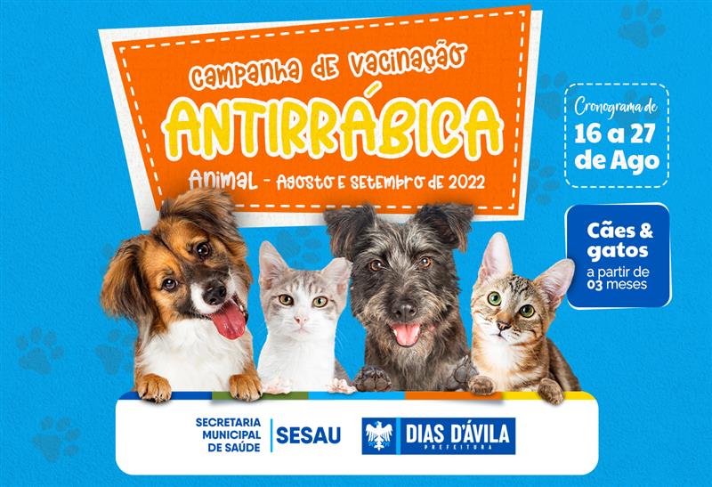 A Prefeitura de Dias d’Ávila continua com a Campanha de Vacinação Antirrábica Animal no município. A partir desta terça-feira (16) até o dia 27 de agosto, a vacinação ocorrerá no Centro de Controle de Zoonoses (CCZ), nos bairros e nas localidades, das 09h às 16h (dias úteis) e das 09h às 12h aos sábados. Podem ser vacinados cães e gatos com idade a partir de 03 meses.