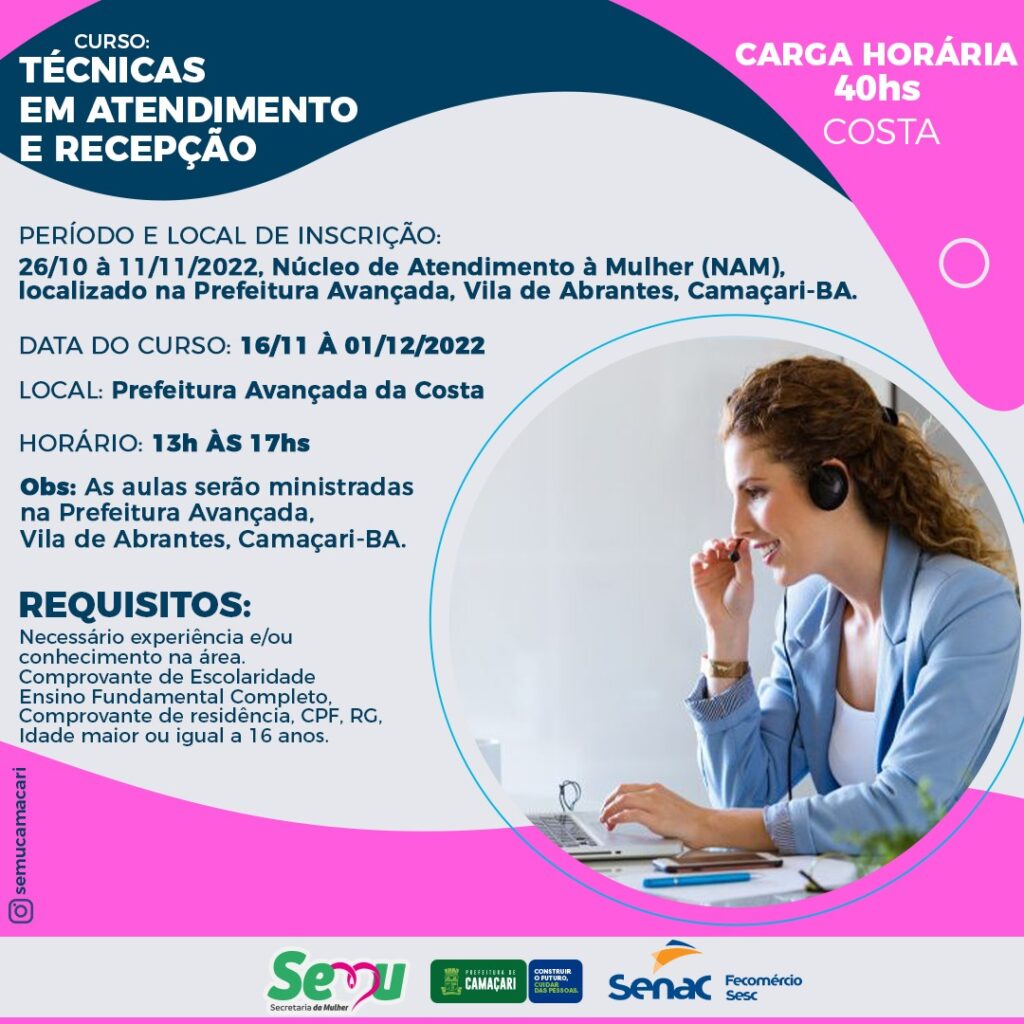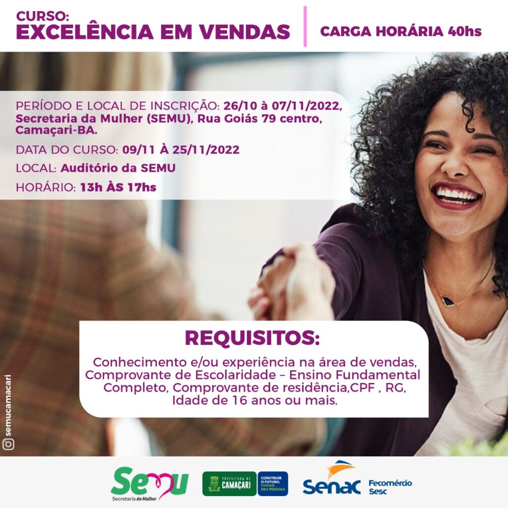 Com carga horária de 40 horas/aula, a Secretaria da Mulher (Semu) de Camaçari, em parceria com o Serviço Nacional de Aprendizagem Comercial (Senac), a Federação do Comércio de Bens, Serviços e Turismo do Estado da Bahia (Fecomércio) e o Serviço Social do Comércio (Sesc), oferece dois curso gratuitos, de Excelência em Vendas, que acontecerá na sede do município, e de Técnicas em Atendimento e Recepção, na costa.