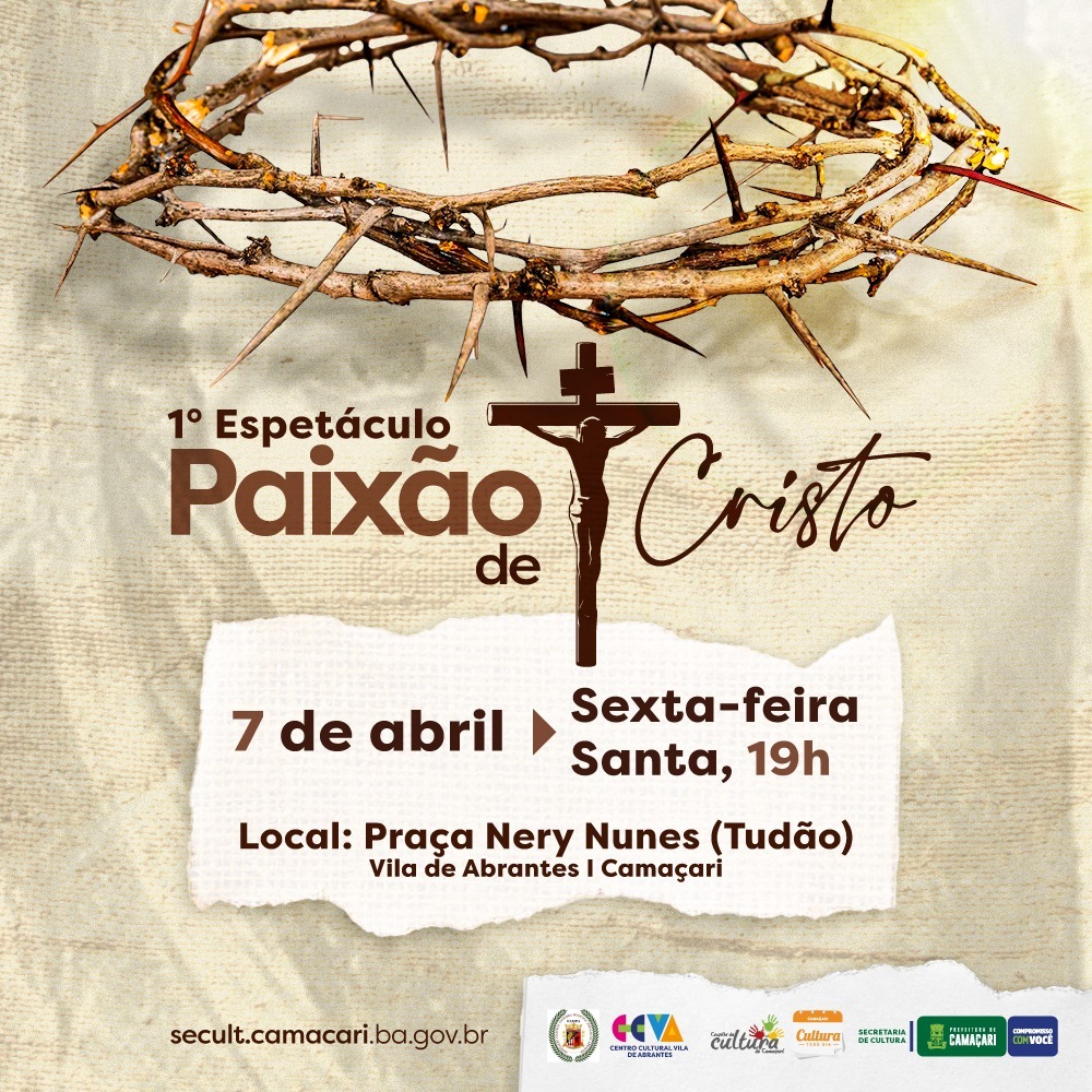 A celebração da Semana Santa, este ano, em Camaçari, contará com uma ação inovadora. A Secretaria da Cultura (Secult) promove na próxima sexta-feira (7/4), às 19h, o 1º espetáculo “A Paixão de Cristo”, encenado na Praça Nery Nunes (Tudão), em Vila de Abrantes. A montagem remonta, especialmente, as 12 horas finais da vida de Jesus Cristo, começando com a narração da tentação na montanha, e seguindo com a Santa Eucarística, na Ceia Pascal, passando por vários momentos até a ressurreição.
