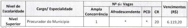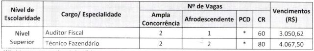 Os valores de inscrição serão divididos em três categorias: 1ª categoria – R$ 94,00 para todos os cargos de nível médio; 2ª categoria – R$ 238,00 para os cargos de Médico, Procurador e Auditor; 3ª categoria – R$ 133,00 para os demais cargos de nível superior.