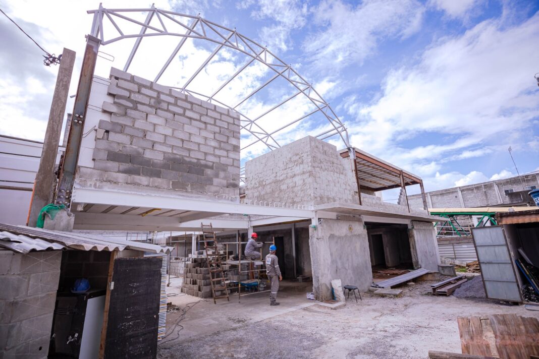 Com a equipe empenhada na execução das atividades, no Cineteatro, que é composto por cerca de 560 m² de área, acontecem as etapas de instalações hidrossanitária e elétrica, execução de alvenarias de vedação, além da estrutura metálica da cobertura da edificação. Segundo a Secretaria da Infraestrutura (Seinfra), foram concluídos no espaço, os serviços de fundação, instalação de estrutura metálica da superestrutura (vigas e pilares) e execução de piso e laje em concreto.