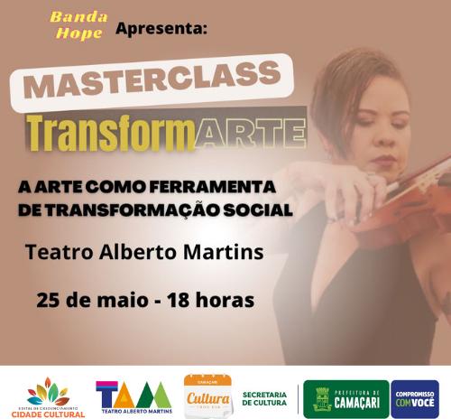 Nesta quinta-feira (25/5), às 18h, o Teatro Alberto Martins (TAM) recebe o evento Masterclass TransformArte, realizado pela banda Hope, por meio do edital de credenciamento Cidade Cultural da Secretaria da Cultura (Secult). A entrada é gratuita. Com o tema “A arte como ferramenta de transformação social”, a atividade irá integrar música, dança, poesia, dentre outros elementos, para falar da arte como ferramenta de transformação social. A programação ainda inclui homenagens a figuras da cultura de Camaçari.