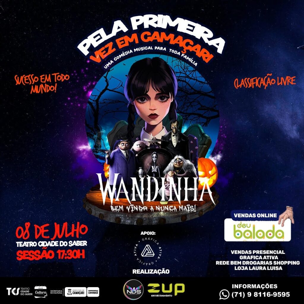 Depois do enorme sucesso nas telas, uma adaptação para os palcos está chegando pela primeira vez a Camaçari, no mês de julho. O espetáculo “Wandinha – Bem vindo a Nunca Mais” estará em cartaz no dia 8/7, às 17h30, no Teatro Cidade do Saber (TCS). A apresentação, que tem patrocínio da Secretaria da Cultura (Secult), é uma comédia musical voltada para toda a família e traz os personagens que dão vida à história.