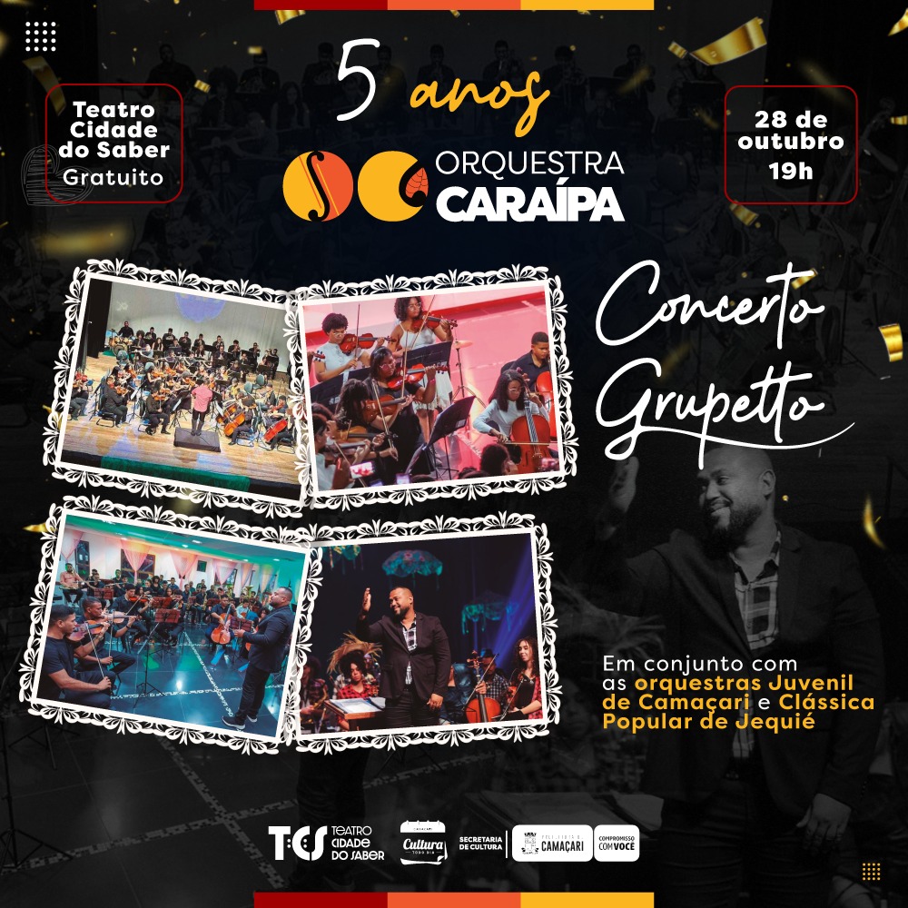 A Orquestra Caraípa, que se tornou um dos mais encantadores frutos culturais da cidade, celebra 5 anos de surgimento presenteando o público com um show especial no dia 28 de outubro, às 19h, oportunidade em que o grupo apresenta no Teatro Cidade do Saber (TCS) o concerto Gruppeto. Com entrada gratuita, o evento é realizado pela Prefeitura de Camaçari, através da Secretaria da Cultura (Secult).