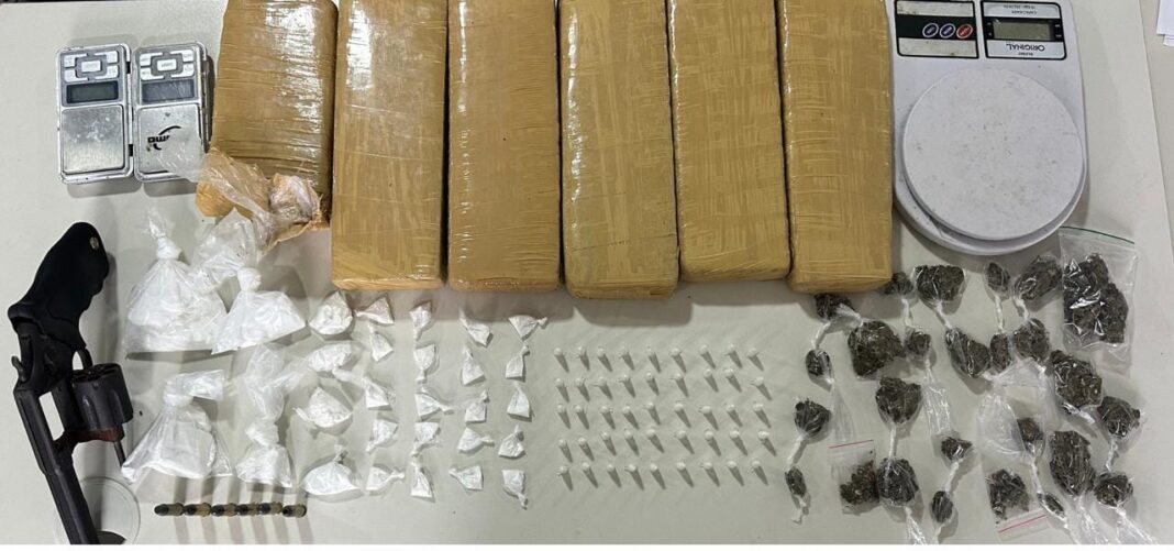Durante policiamento na localidade, os militares, de posse de informações anônimas, chegaram a um indivíduo com mandado em aberto, na Rua Emiliano Zapata. O suspeito estava em uma escada, nas proximidades de uma edificação. Feita a abordagem e a verificação de documento, ficou constatado que o mesmo possuía um mandado de prisão em aberto. Após buscas no local, o homem relatou aos policiais a localização de um revólver calibre .38, seis tabletes de maconha, 26 porções de maconha, 28 porções de cocaína, 45 pinos de cocaína e três balanças digitais.